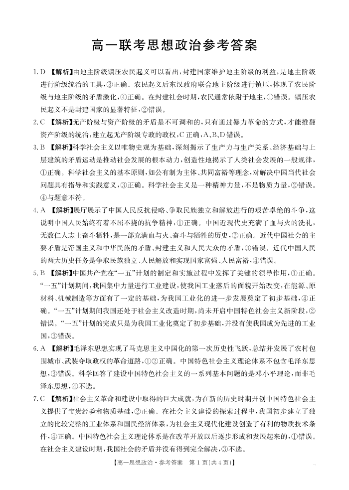 贵州省2024-2025学年度高一年级期中联考 政治答案