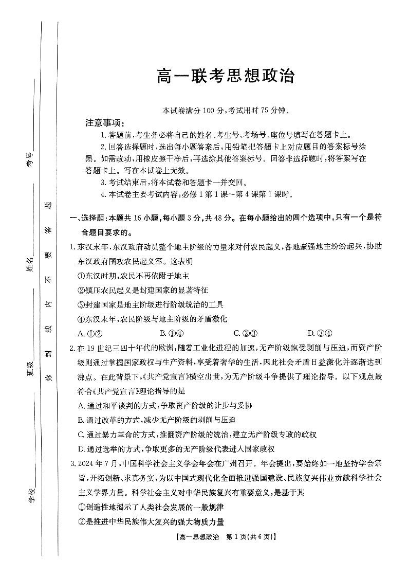 贵州省2024-2025学年度高一年级期中联考 政治