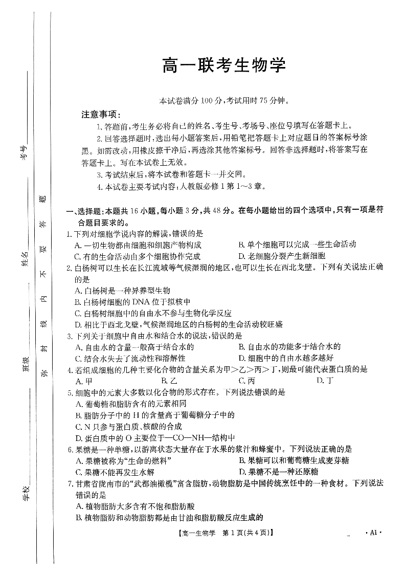 贵州省2024-2025学年度高一年级期中联考 生物学