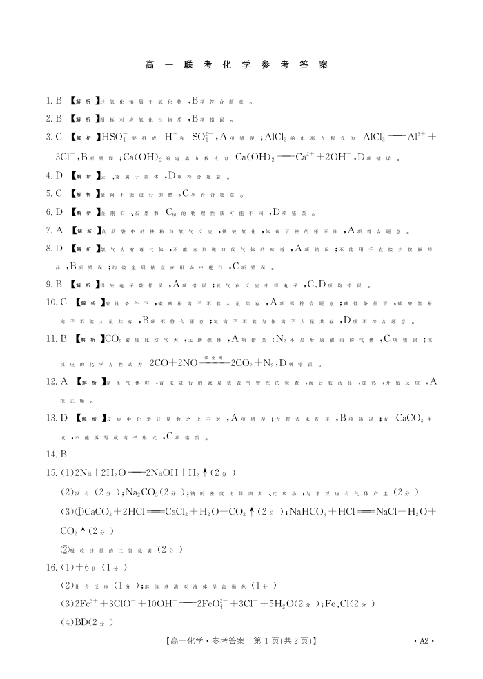 贵州省2024-2025学年度高一年级期中联考 化学答案