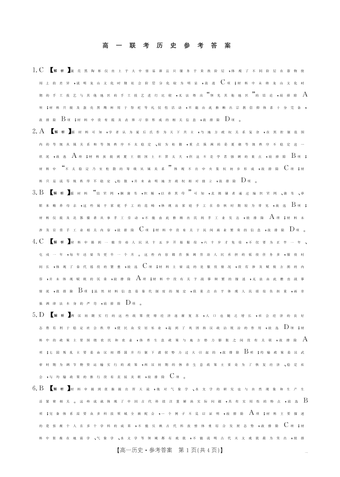 贵州省2024-2025学年度高一年级期中联考 历史答案