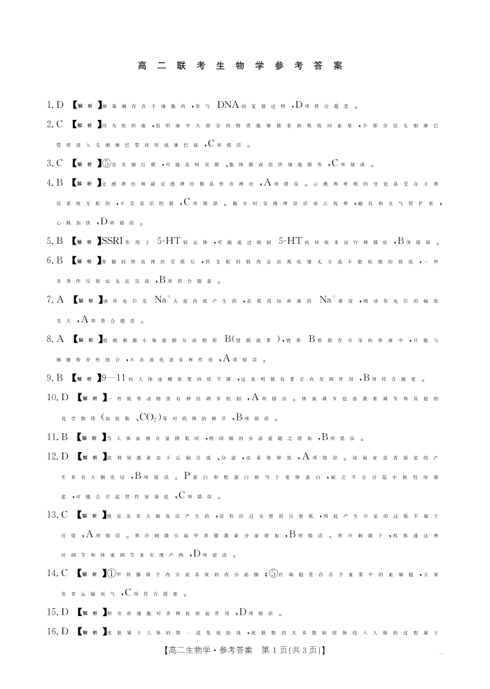 贵州省2024-2025学年度高二年级期中联考 生物答案