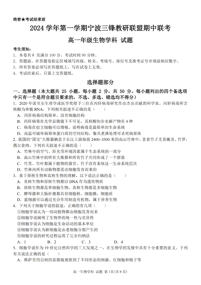 宁波三锋教研联盟2024学年高一第一学期期中联考 生物