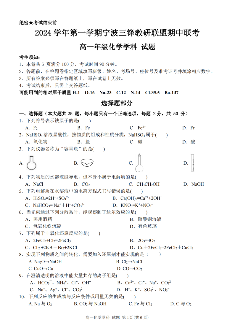 宁波三锋教研联盟2024学年高一第一学期期中联考 化学