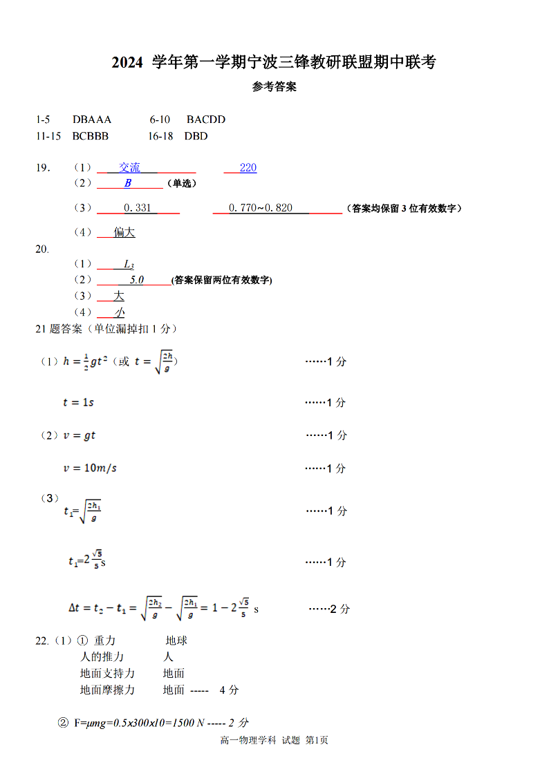 宁波三锋教研联盟2024学年高一第一学期期中联考 物理答案