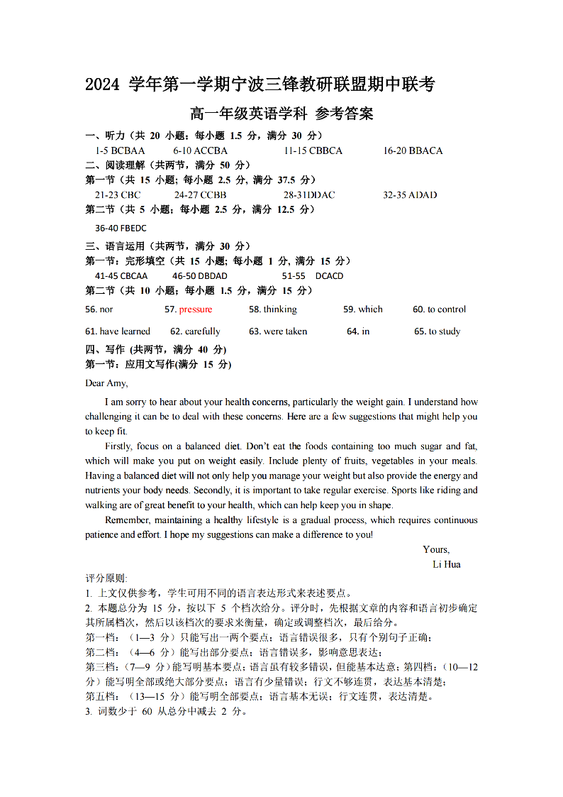 宁波三锋教研联盟2024学年高一第一学期期中联考 英语答案
