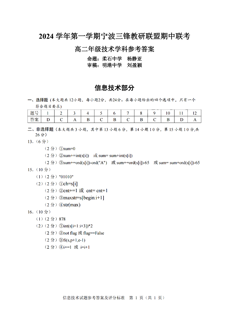 宁波三锋教研联盟2024学年高二第一学期期中联考 技术答案
