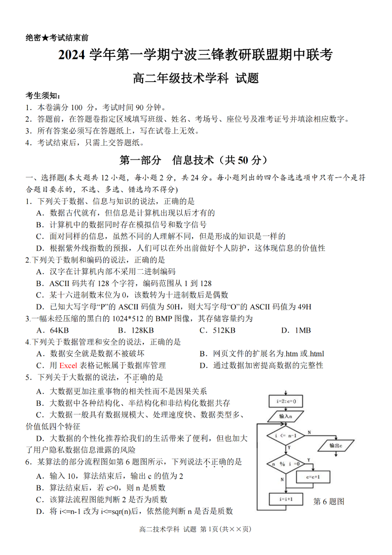 宁波三锋教研联盟2024学年高二第一学期期中联考 技术