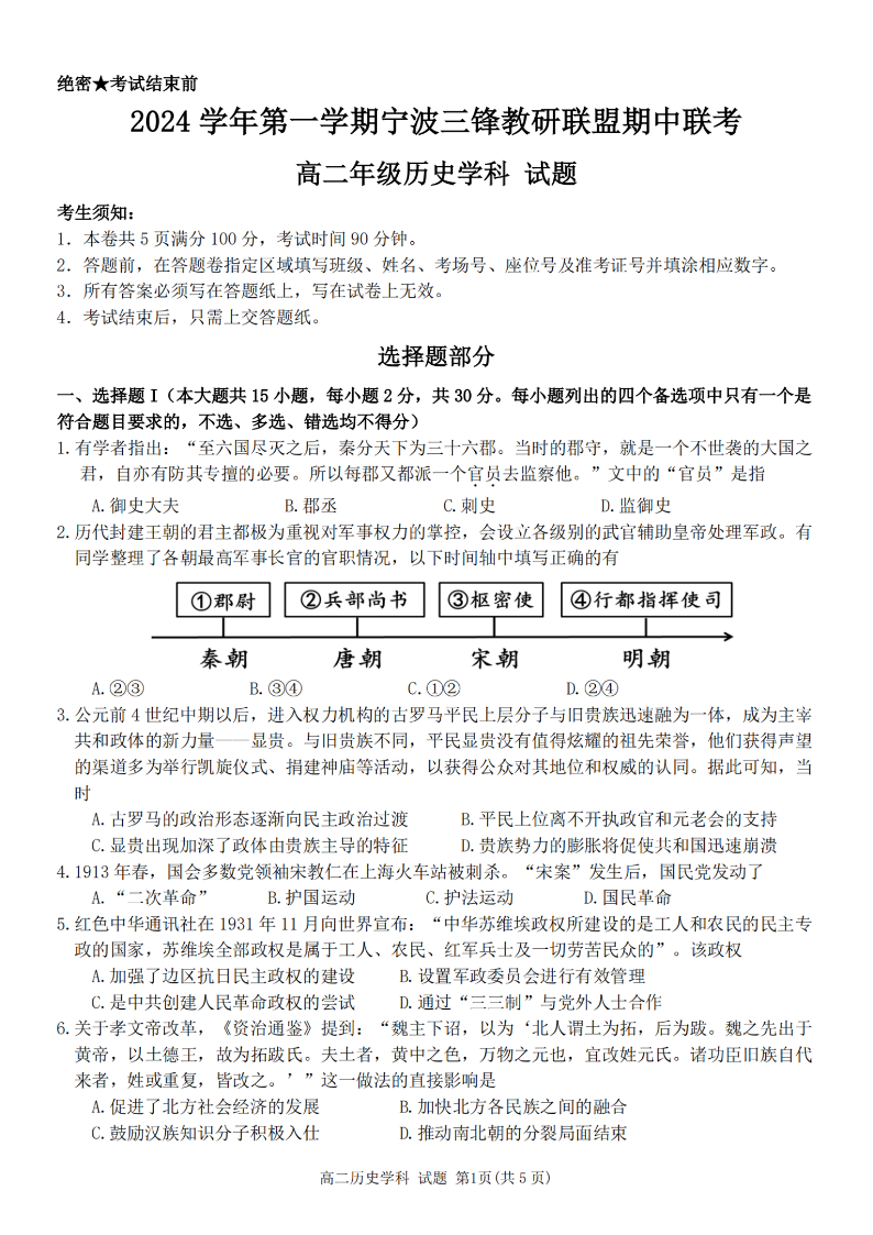 宁波三锋教研联盟2024学年高二第一学期期中联考 历史