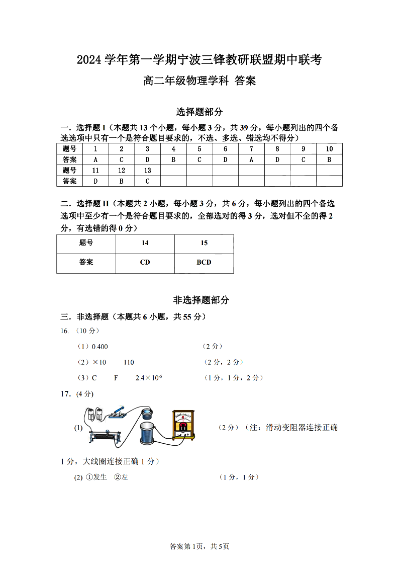 宁波三锋教研联盟2024学年高二第一学期期中联考 物理答案