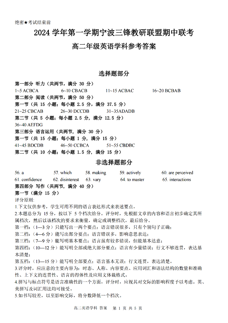 宁波三锋教研联盟2024学年高二第一学期期中联考 英语答案