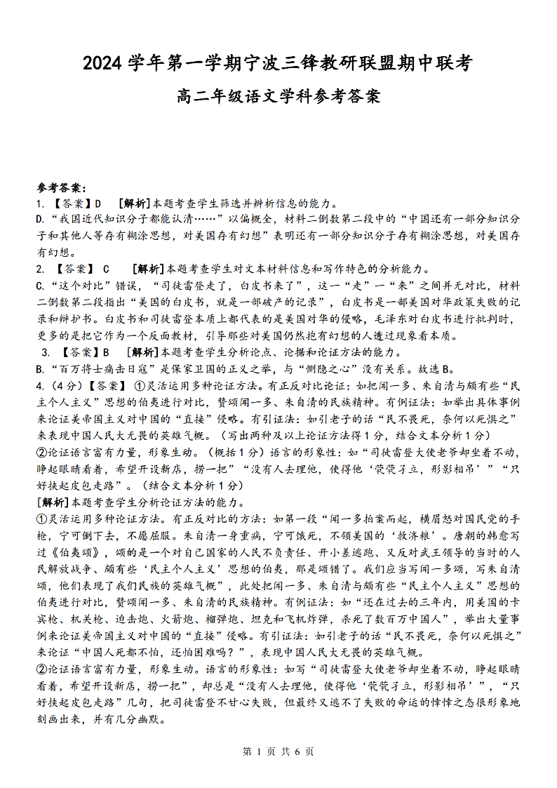 宁波三锋教研联盟2024学年高二第一学期期中联考 语文答案