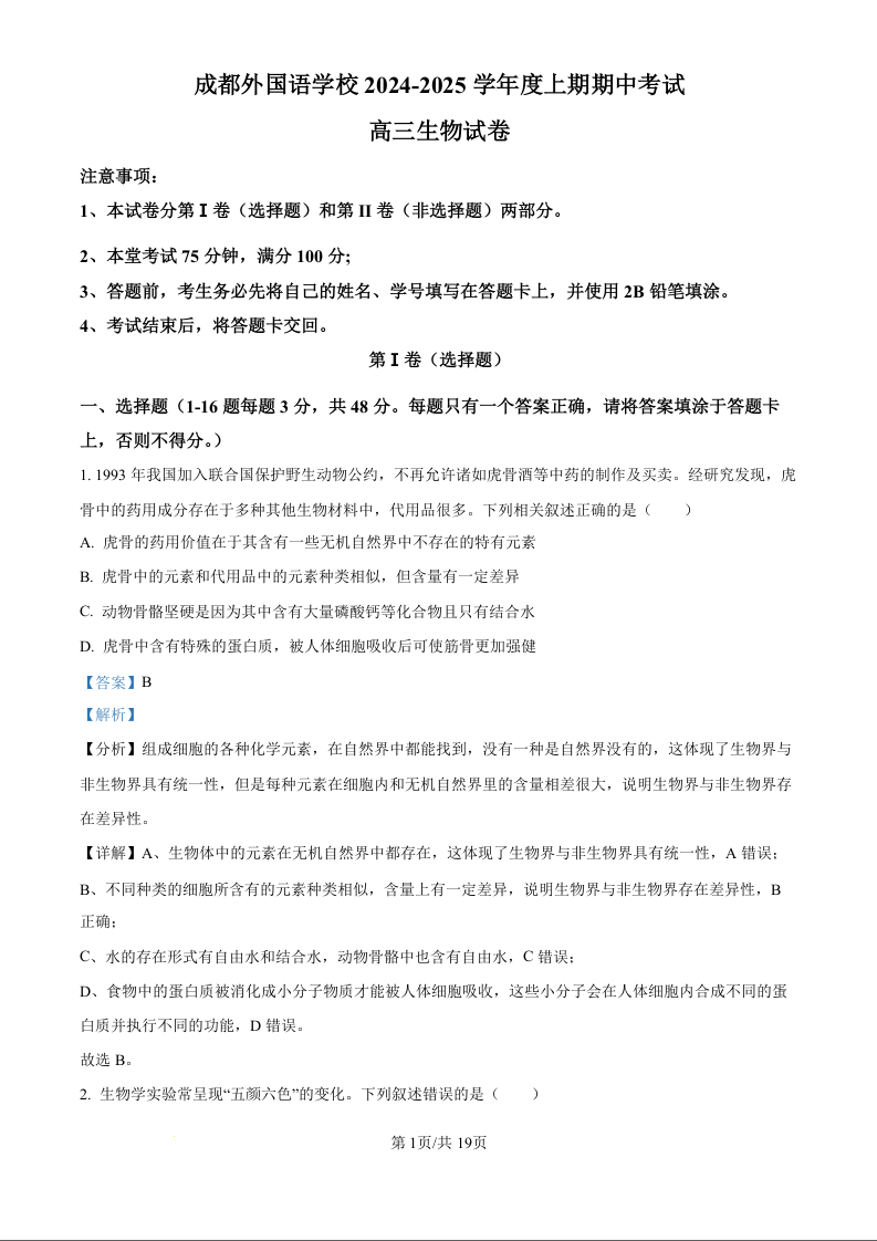 四川省成都外国语学校2025届高三上学期11月期中考试 生物答案