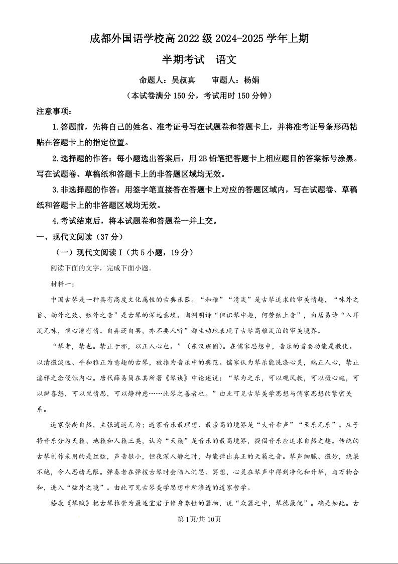 四川省成都外国语学校2025届高三上学期11月期中考试 语文