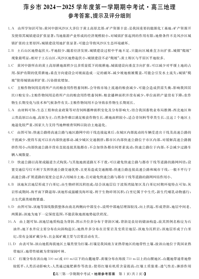 江西省萍乡市2024-2025学年高三上学期期中考试 地理答案