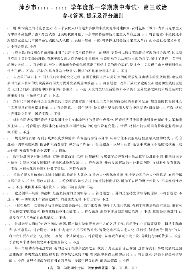 江西省萍乡市2024-2025学年高三上学期期中考试 政治答案
