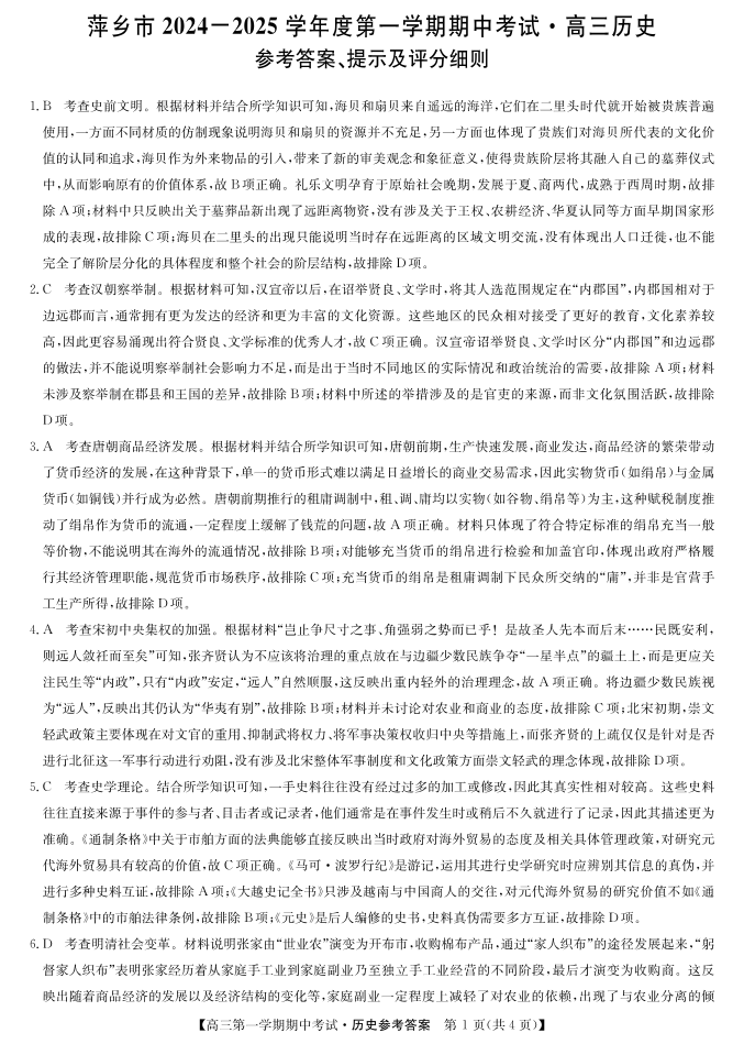 江西省萍乡市2024-2025学年高三上学期期中考试 历史答案