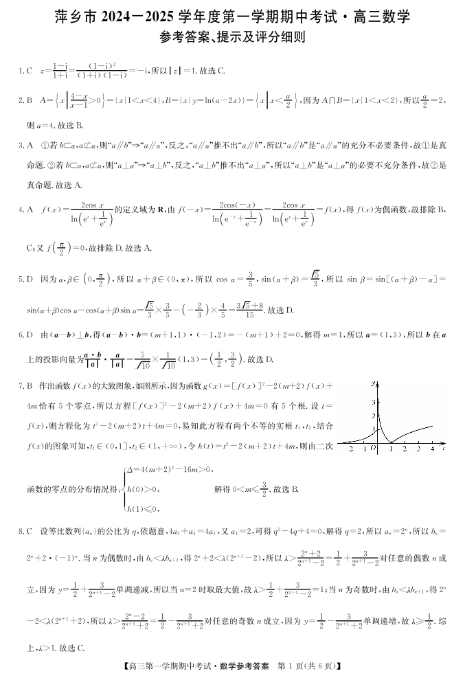 江西省萍乡市2024-2025学年高三上学期期中考试 数学答案