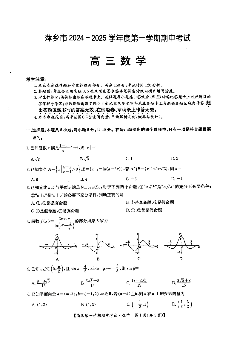 江西省萍乡市2024-2025学年高三上学期期中考试 数学