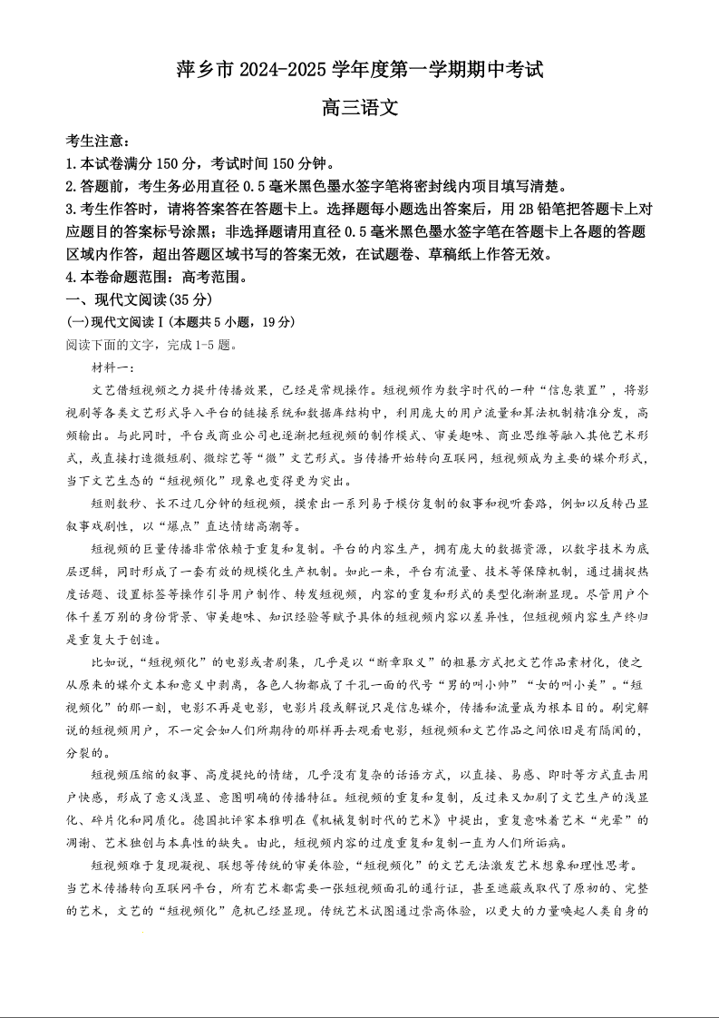 江西省萍乡市2024-2025学年高三上学期期中考试 语文