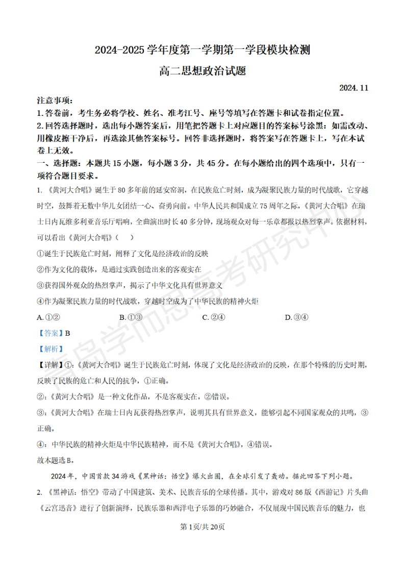 青岛市四区县(胶州、西海岸、平度、莱西)高二上期中 政治参考答案