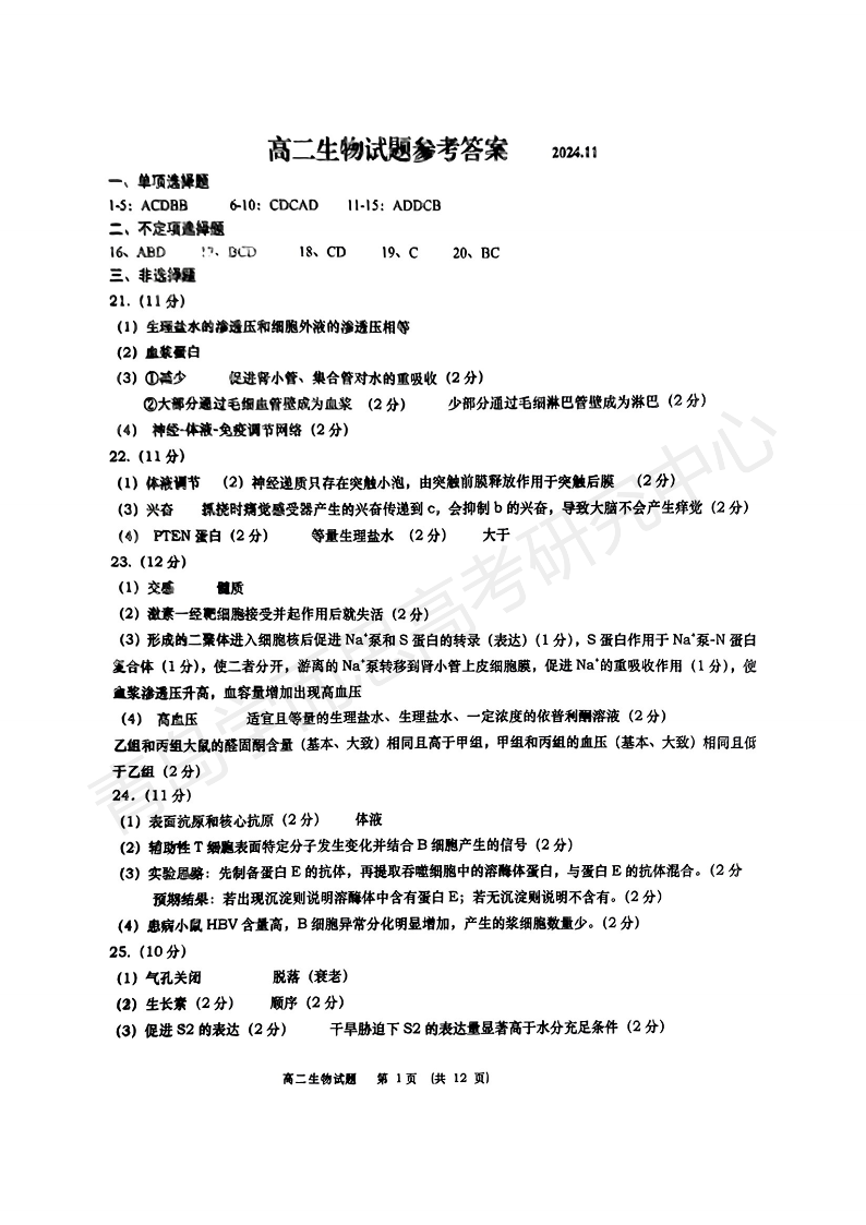 青岛市四区县(胶州、西海岸、平度、莱西)高二上期中 生物参考答案