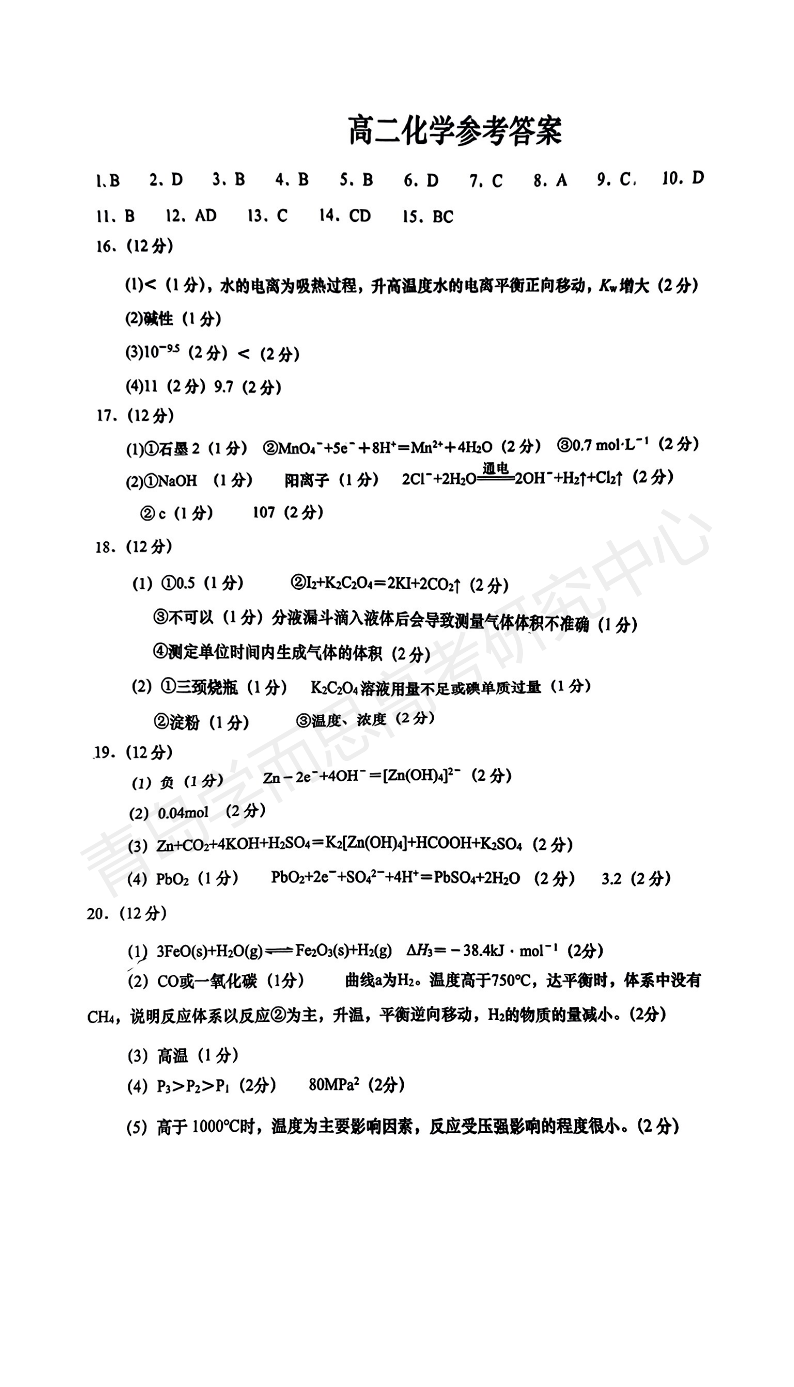 青岛市四区县(胶州、西海岸、平度、莱西)高二上期中 化学参考答案