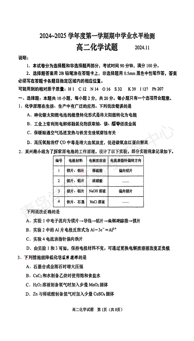青岛市四区县(胶州、西海岸、平度、莱西)高二上期中 化学