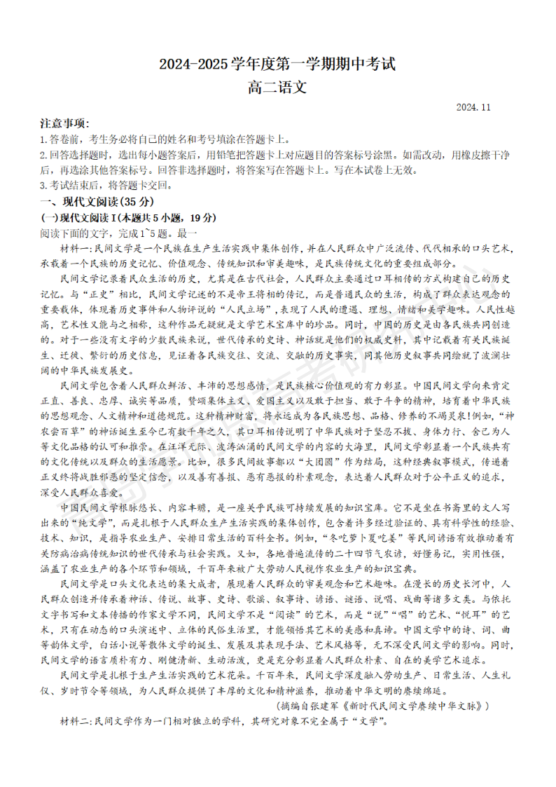 青岛市四区县(胶州、西海岸、平度、莱西)高二上期中 语文