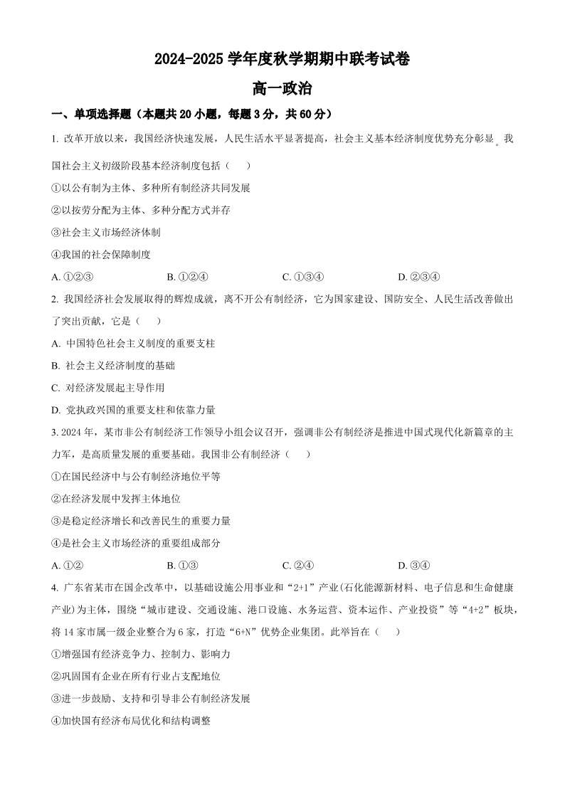 江苏省无锡市江阴市六校2024-2025学年高一上学期11月期中联考 政治