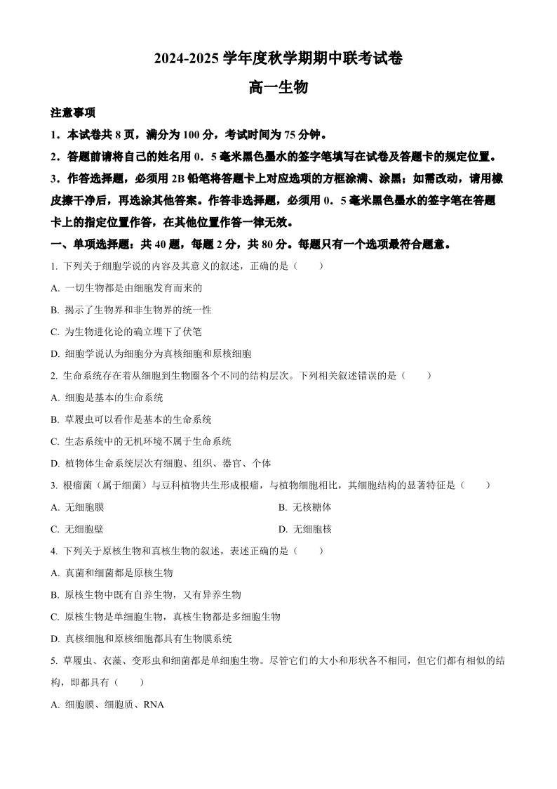 江苏省无锡市江阴市六校2024-2025学年高一上学期11月期中联考 生物