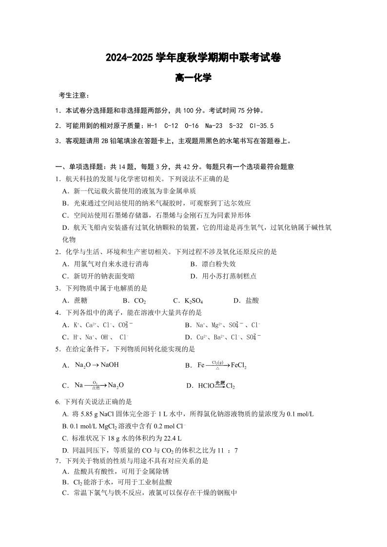 江苏省无锡市江阴市六校2024-2025学年高一上学期11月期中联考 化学