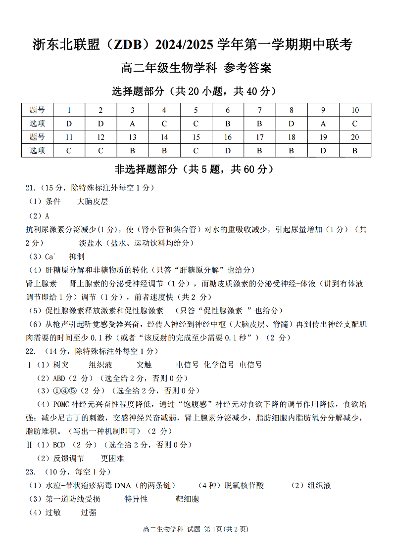 浙东北联盟(ZDB)2024-2025学年高二第一学期期中联考 生物答案