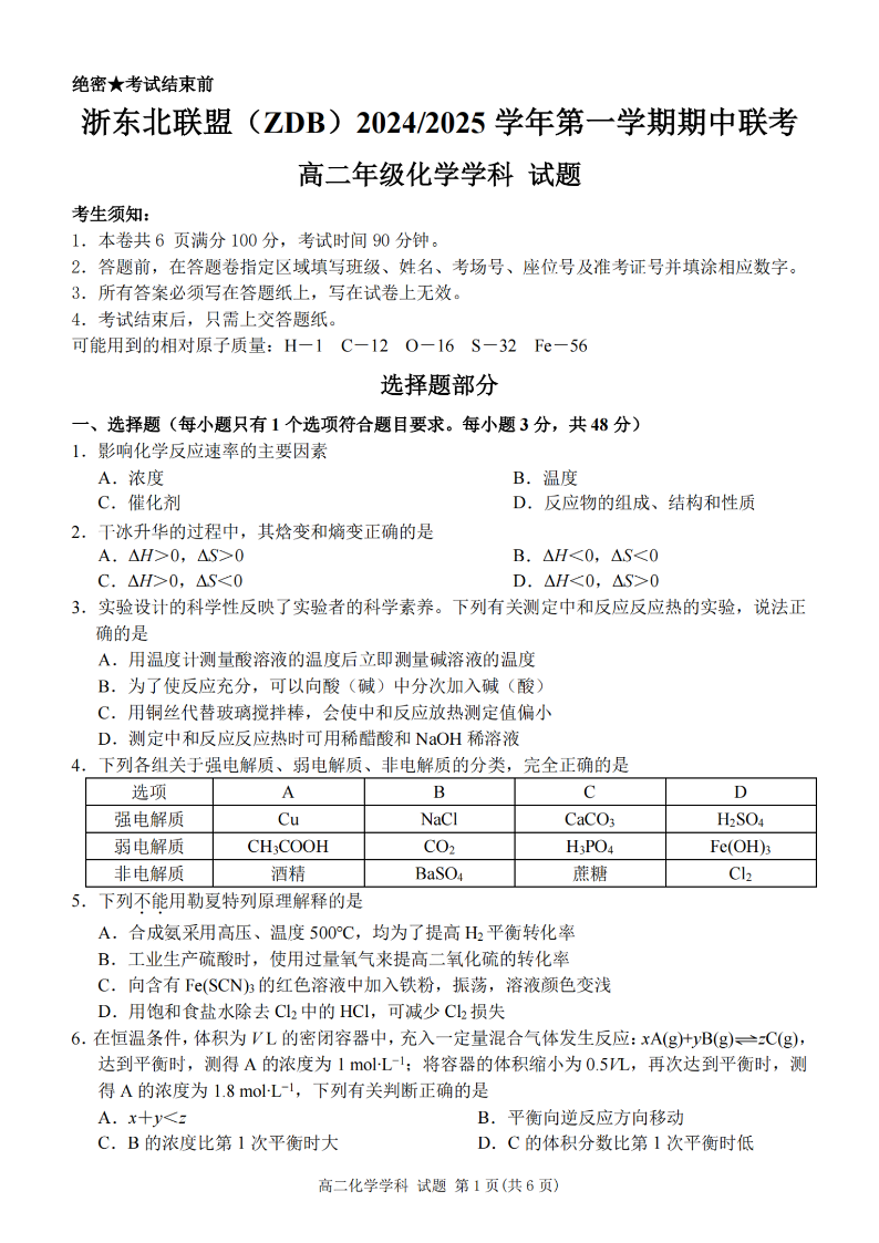 浙东北联盟(ZDB)2024-2025学年高二第一学期期中联考 化学