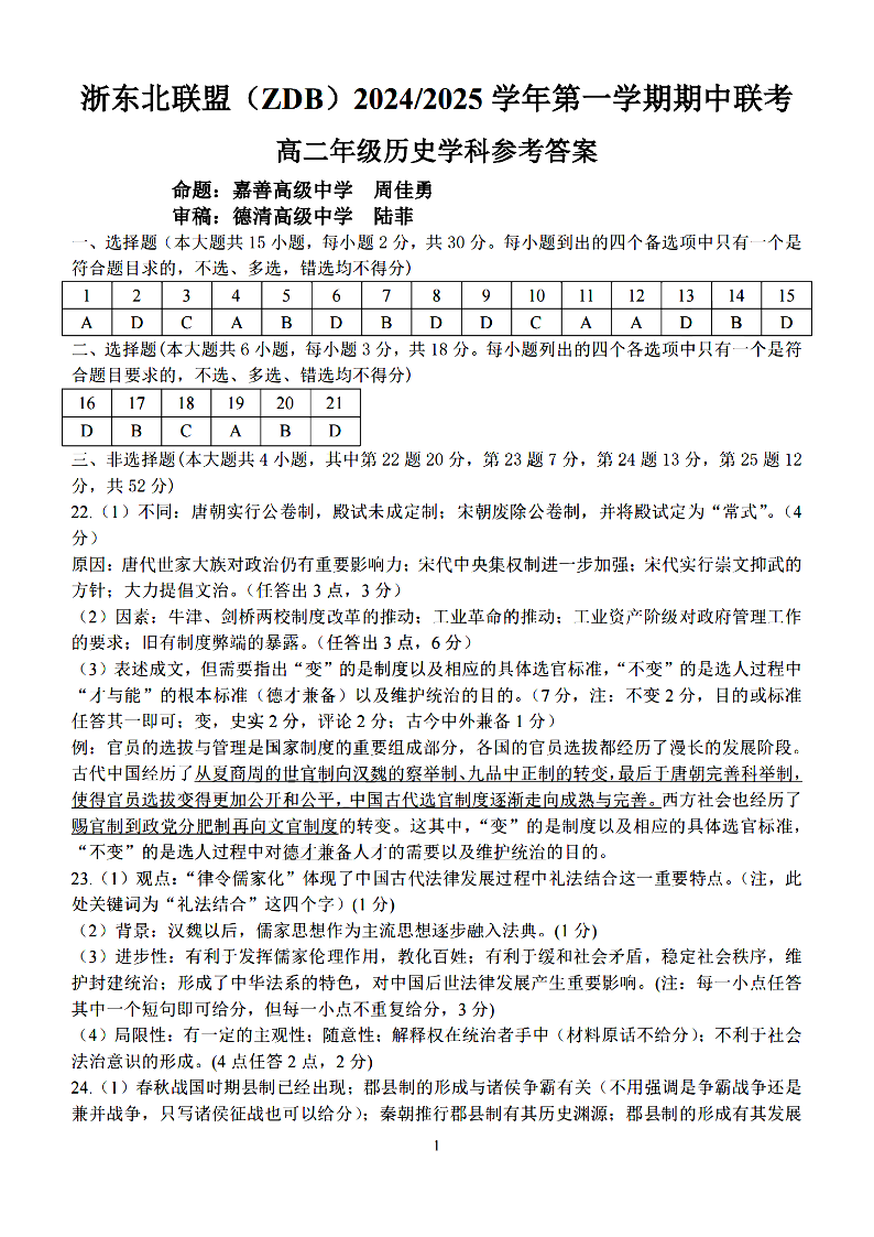 浙东北联盟(ZDB)2024-2025学年高二第一学期期中联考 历史答案