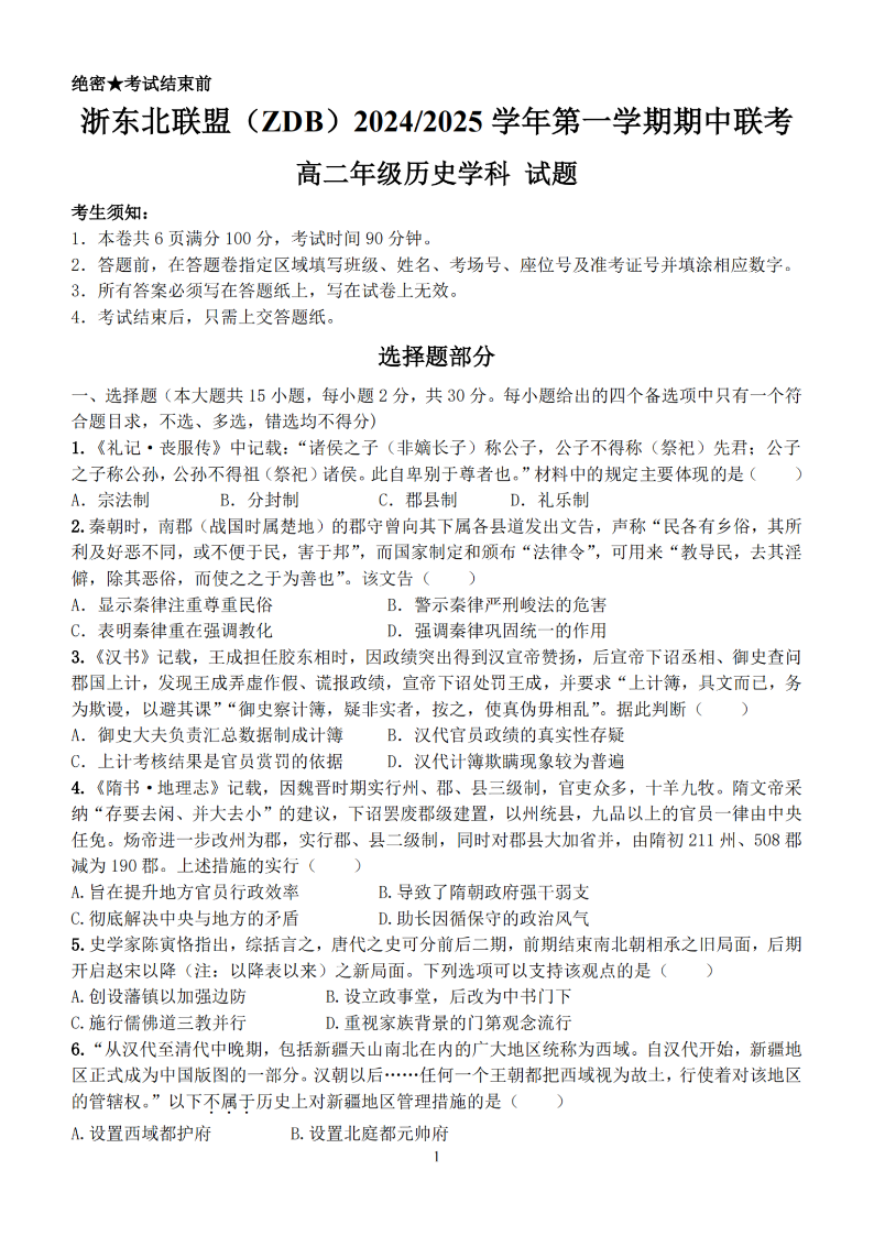 浙东北联盟(ZDB)2024-2025学年高二第一学期期中联考 历史