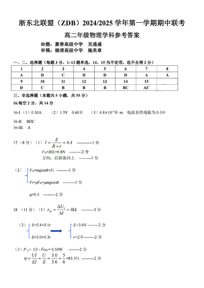 浙东北联盟(ZDB)2024-2025学年高二第一学期期中联考 物理答案