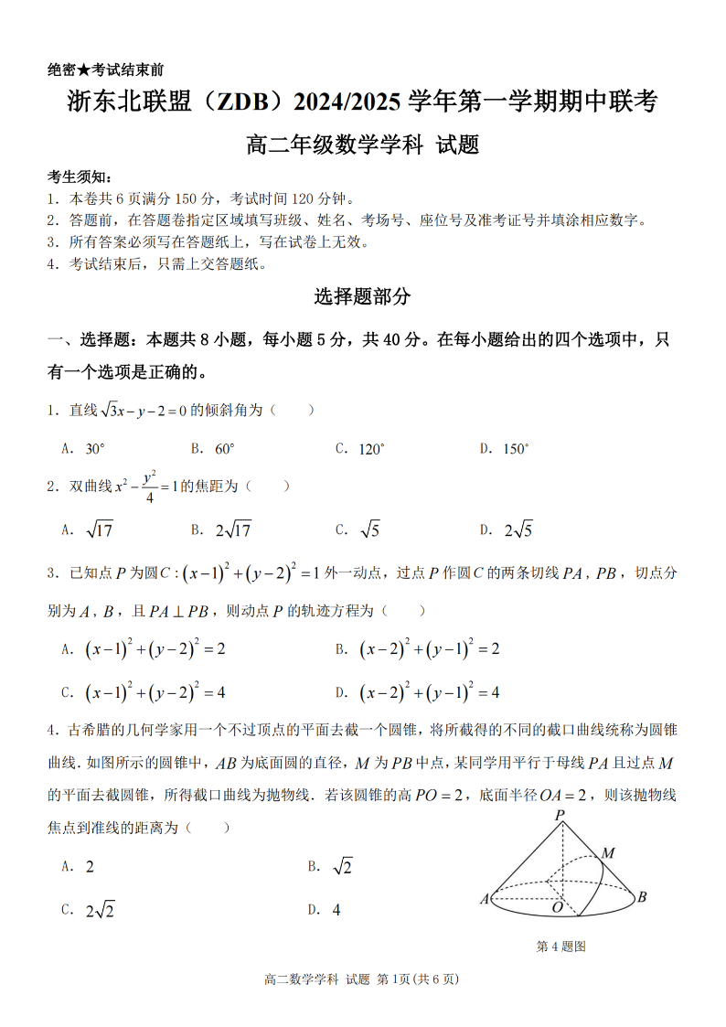 浙东北联盟(ZDB)2024-2025学年高二第一学期期中联考 数学