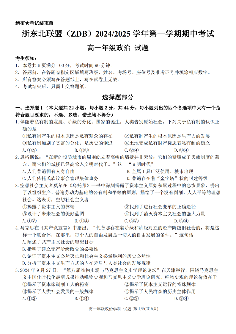浙东北联盟(ZDB)2024-2025学年高一第一学期期中联考 政治