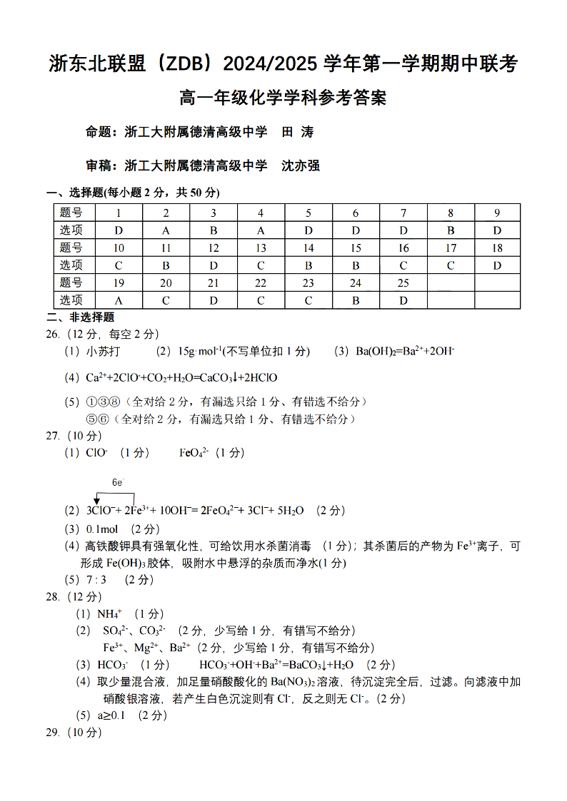 浙东北联盟(ZDB)2024-2025学年高一第一学期期中联考 化学答案