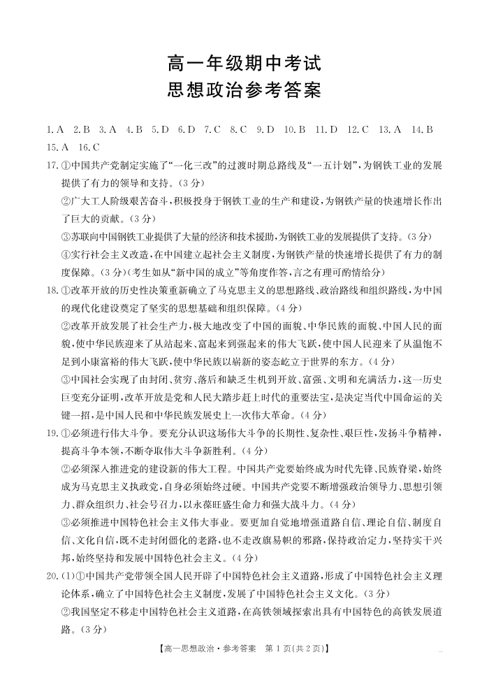 河北省唐山市2024-2025学年高一上学期期中考试 政治答案