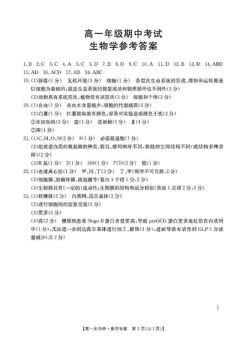 河北省唐山市2024-2025学年高一上学期期中考试 生物答案