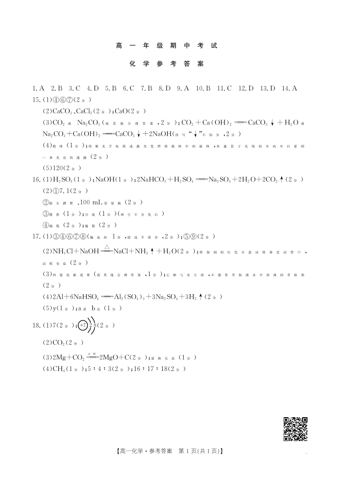 河北省唐山市2024-2025学年高一上学期期中考试 化学答案