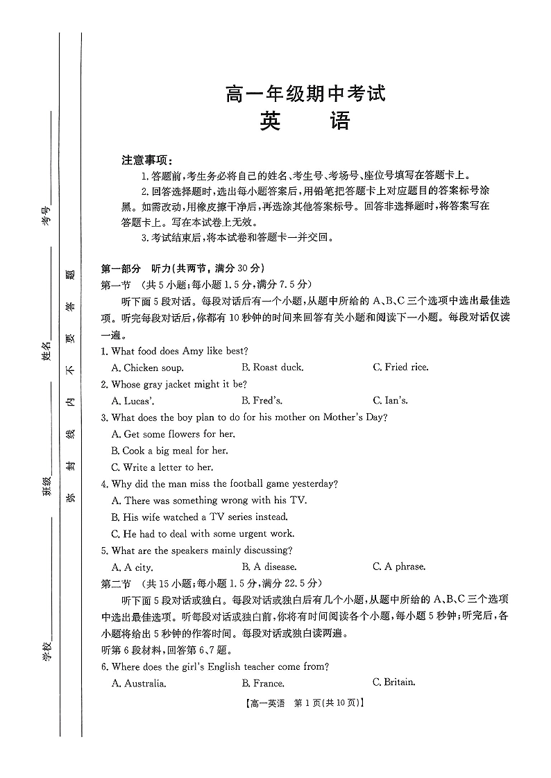 河北省唐山市2024-2025学年高一上学期期中考试 英语