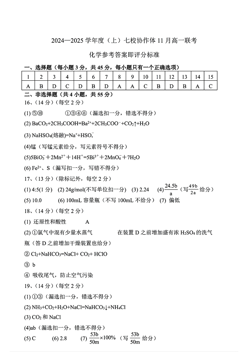 辽宁省丹东市七校协作体2024-2025学年高一上学期期中考试 化学答案