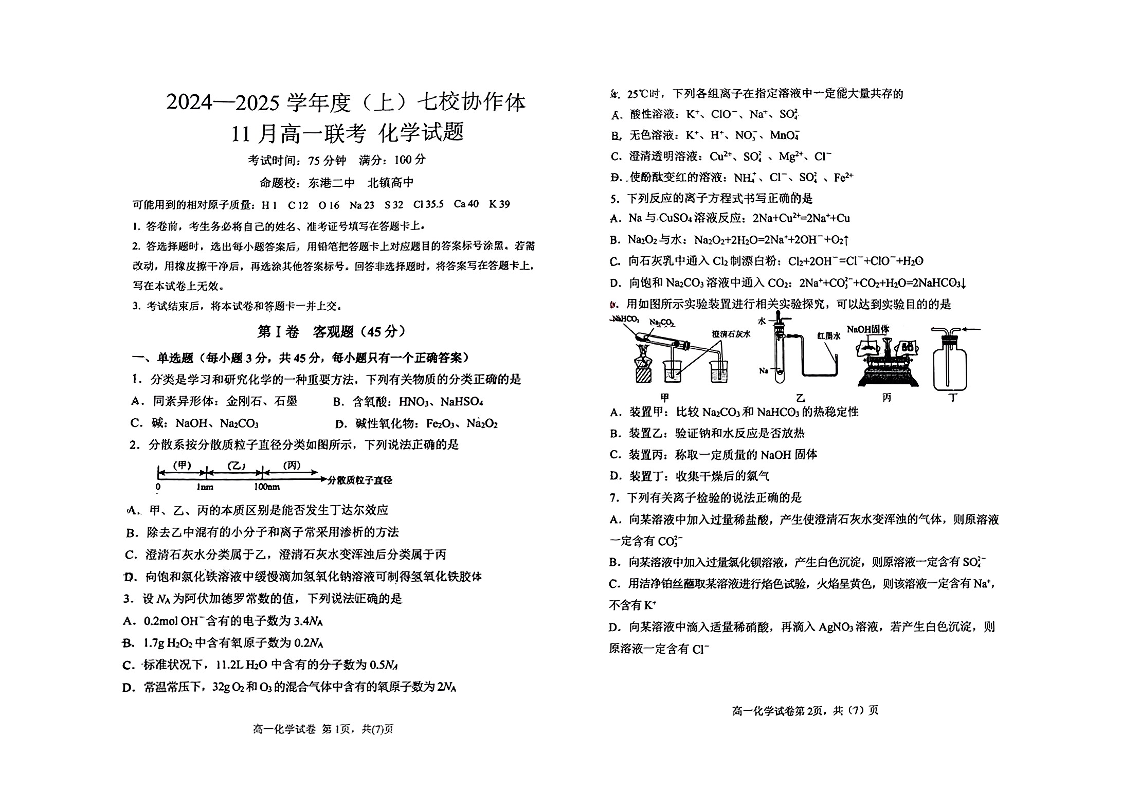 辽宁省丹东市七校协作体2024-2025学年高一上学期期中考试 化学