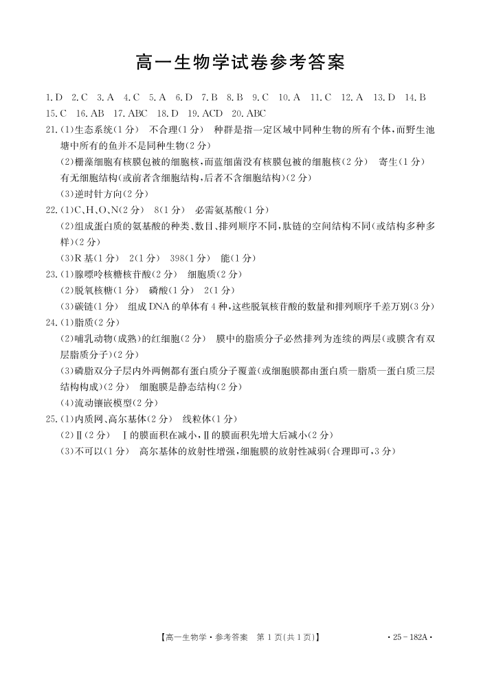 内蒙古赤峰市名校2024-2025学年高一上学期期中联考 生物答案