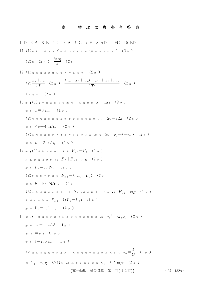 内蒙古赤峰市名校2024-2025学年高一上学期期中联考 物理答案