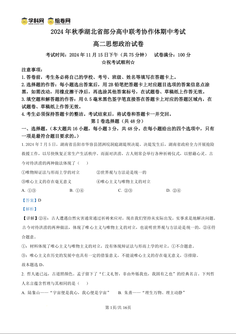 2024年湖北部分名校高二期中联考 政治答案