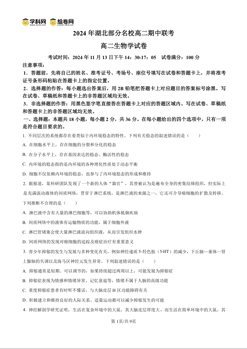 2024年湖北部分名校高二期中联考 生物